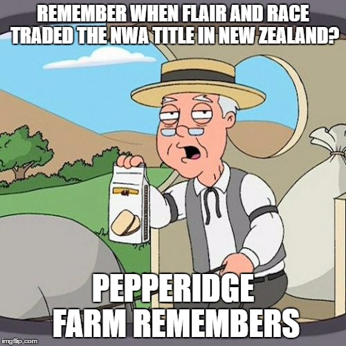 – Flair did a job to Wahoo on a Central States show, and Dave thinks it’s a sign that he’ll get his fourth World title soon from Kerry. In fact, at the rate he’s going Flair might even have a DOZEN World titles when all is said and done!