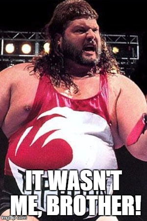 – Speaking of Sharpe, he did a sold show in NJ with a paid attendance announced of 1 person, and a gate of $10. (Actual attendance was 125 people). It was a present from a guy’s wife, for a mere $10,000, and the lucky guy got to beat Iron Mike Sharpe in the main event after his wife/manager was ejected for interference. (If only we had an Earl Hebner to send OUR wives back to the dressing room some days, AM I RIGHT, Fellas? UP HERE!)