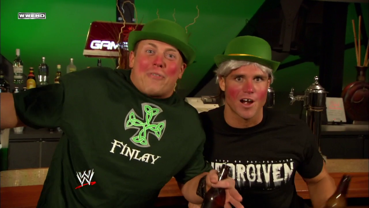 Mark Henry & Tony Atlas join them and Miz & Morrison kiss up to them. Then Chavo & Neely show up with overdubbed farting and mocking mariachi music. Miz & Morrison explain Finlay couldn’t be here as he couldn’t get a babysitter for Hornswoggle so they cut to Finlay’s brothers: