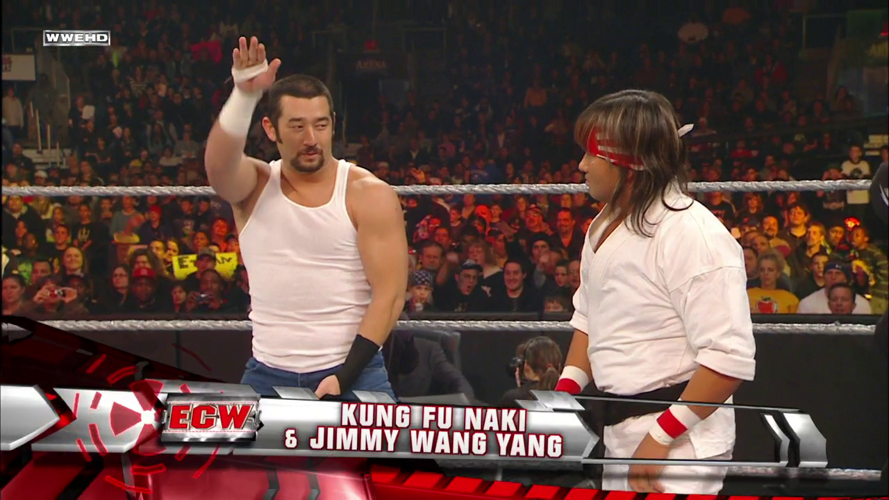 Miz & Morrison won the Slammy Award yesterday for tag team of the year, practically by default. It’s been a while since we’ve seen Jimmy after that cool feud with M & M earlier this year. This is Funaki’s first ECW on Sci-Fi appearance and I don’t remember anything about this gimmick apart from him using the Jimmy Hart version of Everybody Was Kung Fu Fighting for his entrance. Funaki throws a few kicks to show he’s very serious. Todd explains Yang’s gimmick as ”he’s from Georgia, which is in the South.” Wang busts out a standing moonsault but the reaction for Miz & Morrison is more positive than usual. C’mon guys how can you not cheer Team We Definitely Understand Japanese People. Funaki avoids Morrison’s spinning wheel kick to karate kick him out the ring. Miz distracts Funaki as…we go to break. Dammit I was hoping this would be brief. Chinlocks for Funaki as Striker lies and says the crowd is behind him as they cheer Miz’s corner clothesline. Miz & Morrison continue to destroy Funaki until Wang gets the cold tag. His high-flying reminds the crowd he can do cool kicks and flips when he’s not in dark matches. Wang escapes the Starship Pain but misses a top-rope moonsault and gets caught with the springboard kick for the win.