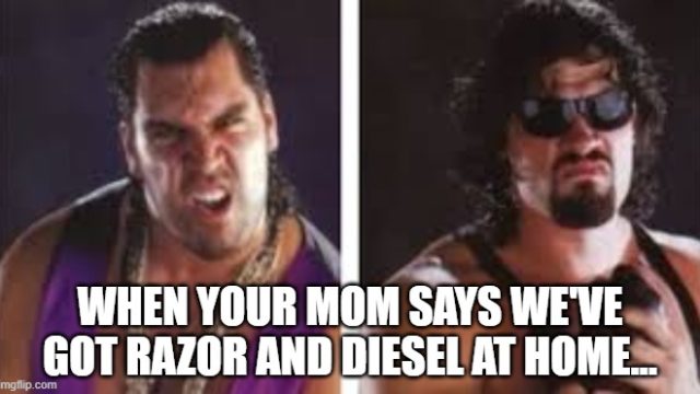 – The day after the Mindgames PPV, RAW was supposed to be the biggest show of the year, their “new fall season”, featuring the finals of the Intercontinental title tournament that was moved off the PPV in order to help the rating. Plus they were finally debuting the much-ballyhooed payoff the Razor & Diesel, which Dave now notes will go down as “the biggest flop since the Edsel”. (Using “ballyhoo” and referencing the Ford Edsel in the same paragraph, showing that Dave really has his finger on the pulse of the youth of 1996.)