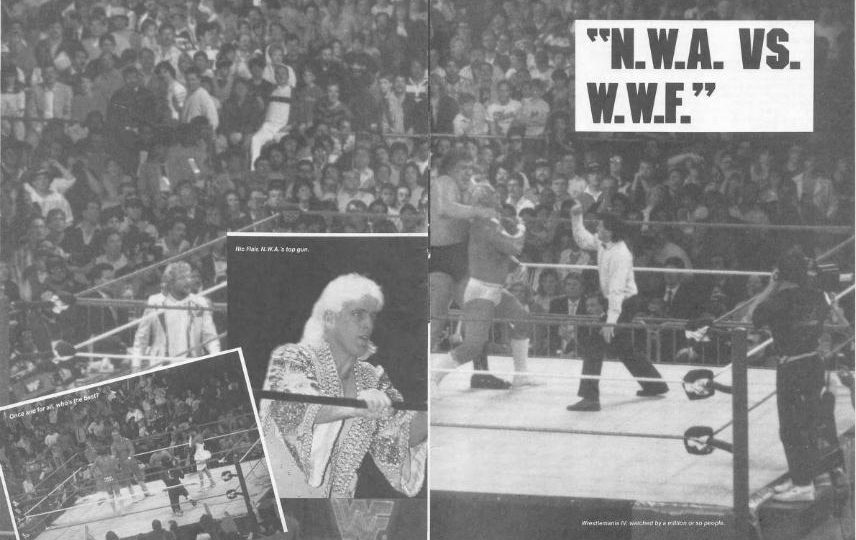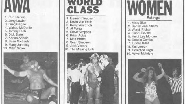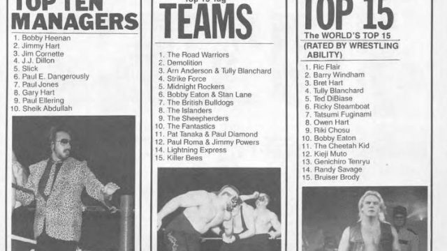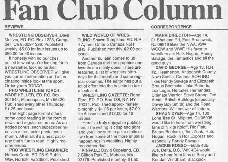 We move on to Letters to the Editor… Rich from Freeport, Illinois says he can’t believe Hulk Hogan interfered in Randy Savage’s match against Ted DiBiase at WrestleMania IV. Had it been Bobby Heenan or Jimmy Hart, everyone would have booed. Instead they cheered. What gives? Rick from Millville, New Brunswick writes in to say he thinks the Midnight Rider is Dusty Rhodes. Anna from Westchester, Illinois says she bets Hulk Hogan wishes he had a body like her new favorite wrestler, Rick Rude. “Maybe Hogan should take some lessons from Rick Rude on how to become a real man.” Jason from Philadelphia says that a year ago, Mad Dog D.C. Drake defended his title against Jules Strongbow in a dog collar match. He’d like to see them meet again in a dog collar, steel cage, anything goes match with barbed wire on the top of the cage. “If this match ever does come up, can you please put color pin ups of that match in your magazine?” Shaun from Milpitas, California says he likes the Ultimate Warrior and Don Muraco and hates Ted DiBiase, Demolition, and especially the Honky Tonk Man. Keith from Pompton Lakes, New Jersey takes exception to fans that say Demolition is ripping off the Road Warriors. ” He says the Road Warriors wear cheap clothes and have stupid haircuts. “Demolition could take on the Road Warriors any day of the week.” Bobby from Sikeston, Montana says she’s sick of double standards. When Ron Bass brings his whip to the ring, it’s called a weapon. When Hacksaw Duggan brings his 2×4, it’s fine and dandy. Lastly, H.R. from Sandusky, Ohio says he’d like to see “Nature Boy” Buddy Landell jump to the NWA and join the Four Horsemen.