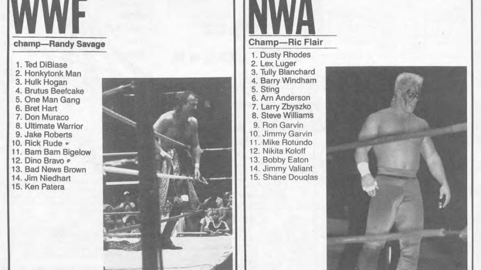 Next, an article about the NWA vs. the WWF by Tom Clutters. Tom says it feels like these organizations have been at war forever, and he’s here to give you a better understanding of it all. He begins by explaining the administrations. “Basically, it works out to Jim Crockett (NWA) vs. Vince McMahon (WWF). Both men obtained a great deal of their wrestling interest and connections from their fathers, but both have raised their respective associations to heights their papas would have never imagined. Crockett is just about always recognized as the NWA chief, while McMahon still contends that his sole purpose in the WWF is to announce, and that he has little knowledge of the federation’s inner workings. In addition to Crockett, men like Dusty Rhodes, Gene Anderson and his brother David Crockett control most of the goings on. On the other hand, McMahon uses Jack Tunney in the role of president to make decisions. Tunney is a figurehead, nothing more. In addition, McMahon has numerous ex-wrestlers like Gorilla Monsoon, Tony Garea, and Lord Alfred Hayes on his staff. In short, neither organization has ever been willing to let the fans know exactly who is running the show.” Tom then moves on the wrestling talent. “For the most part, all the major stars for both federations have been successful elsewhere. Only NWA champion Ric Flair has stayed with virtually one organization. Hulk Hogan, for all his publicity, was once a major star in the AWA. Several of the top WWF stars, including Andre the Giant, Ted DiBiase, Ricky Steamboat, Rick Rude, Harley Race, and Greg Valentine, have all been stars in the NWA at one time. Meanwhile, Dusty Rhodes, Larry Zbyszko, Barry Windham and Mike Rotundo all experienced major success in the WWF. New-crowned WWF champ Randy Savage was a star in southern promotions before joining McMahon. Even tag team champions Demolition are not, as you might believe, WWF discoveries. The man known as Ax is in reality Bill Eadie, who gained worldwide fame as the Masked Superstar in past years, and Smash is none other than Barry Darsow, who worked as Krusher Khruschev in the NWA a while back. The former tag team champions, Rick Martel & Tito Santana, achieved fame in the AWA and NWA respectively in recent years.” Tom also mentions that the UWF has spilled into the NWA and WWF with Steve Williams, Sting, Rick Steiner, Ted DiBiase, Hacksaw Jim Duggan, and The One Man Gang all making their mark there before heading for greener pastures. As for how McMahon and Crockett promote wrestling, McMahon favors a more circus-like environment whereas Crockett has always insisted on quality competition. That said, the NWA has gotten silly at times too. “If you thought Hulk Hogan was bigger than life, how about Lazer-Tron? Introduced as hailing from Outer Space and called the protector of children, Lazer-Tron won the NWA Jr. Heavyweight title late in 1987, then disappeared. For those who might not have known, the man under the Lazer-Tron guise was Hector Guerroro.” (Well that will probably be the most embarrassing gimmick he ever does, right?) But the WWF takes it further, treating the fans like first-graders and rewriting history. “When the whole Hogan-Andre feud began, WWF announcers insisted the two had never met before when in reality, they had clashed on more than one occasion in front of thousands.” As for announcers, Tom says McMahon and Jesse Ventura aren’t bad together. “McMahon is an excellent “blow-by-blow” announcer, and Ventura’s pro-heel commentary, while a little ridiculous at times, gives the duo good balance.” Tom also has good things to say about Mean Gene Okerlund and Howard Finkel while saying Craig DeGeorge has potential. “But Lord Alfred Hayes, a man who knows the business inside and out, remains unable to get his message across to the public most of the time.” (Screw you, Tom. Lord Alfred rocked. I especially loved when he listed the sponsors of the show. He added a touch of class to the “sport of kings.”) As for Gorilla Monsoon, Tom says, “Don’t even get me started.” (Gorilla would no doubt call Tom a piece of garbage.) In the NWA, “Tony Schiavone has improved steadily since moving over from baseball,” and “Bob Caudle, a veteran of more than 20 years behind the mike, is somewhat colorless bust still manages to make things interesting. (Bob rocked too.) “Jim Ross, maybe the best catch the NWA made from the UWF, gets overly excited at times but does well in other departments, including interviews.” Tom then goes on to mention David Crockett, saying “Big brother Jim might do well to include little brother on more telecasts. He lends an energy to TV events that no one else has yet produced.” (So Jim gets “overly excited” but David “lends an energy”?) Tom then runs down the head to head competition between the two, saying the WWF ran Survivor Series against Starrcade on Thanksgiving Day in 1987, “and the result was a disaster for the WWF.” Then the NWA tried to run Clash of the Champions against WrestleMania IV and “While WrestleMania was arguably the best of the two, the NWA got high marks for a well-staged program.” Tom says, “Don’t be surprised if McMahon comes up with a counter for the NWA’s annual “Great American Bash” tour this summer.” (And indeed, McMahon ran WrestleFest in Milwaukee the night before the Bash tour came through the same city—simultaneously messing with the AWA, which had a show booked two nights before in nearby Two Rivers.) Tom then moves on to some odds and ends. He says, “The NWA still has the annoying habit of closing out TV programs in the middle of a main event,” but “The WWF has too many managers.” Tom adds, “Thank goodness that Missy Hyatt couldn’t make the grade in either organization.” When it comes to referees, “Tommy Young of the NWA and Joey Marella of the WWF are two of the best officials.” And as for literature, “WWF Magazine listed Ran