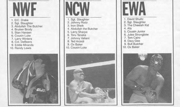 Next, we get a gossip column from “The Phantom of the Ring.” The Phantom reports the Iron Sheik is returning the WWF very soon. Meanwhile, Paul E. Dangerously is improving tremendously and is hosting the program “Pro Wrestling This Week.” Barry Windham is now a Horseman, and Wrestling Eye predicted it! Roddy Piper is supposed to return to wrestling in the Oregon area. Bret Hart and Bad News Brown are having tremendous matches, and if they wrestle in your town, be sure not to miss it. (Actually I did see them wrestle, and it wasn’t good.) George Steele recently had a heart attack and was hospitalized. Harley Race, who had intestinal problems, was also hospitalized but should be out shortly. (This injury originally happened after Race went through a table in a match with Hogan. I’ll have more on this in future recaps.) Big Bubba is headed to the WWF where he will take on a prison gimmick. Steve Williams and Terry Gordy are headed to the WWF and should be there by summer. (Awesome! I can’t wait to see them at Summerslam.) Big John Studd will there in August. Lou Perez, younger brother of Al Perez, is wrestling for Global Wrestling out of Florida. Butch Reed has been fired by the WWF for unknown reasons. In a cost cutting move, managers in the WWF are no longer being asked to do house shows. The AWA is planning to tour the New York Metro Area on a regular basis. (Don’t do it!) Luger seems to have cured his ever present jock itch. (??) The USWA is doing a few shows this summer with the Beach Boys. Word is that the Green Machine who has been wrestling Jimmy Valiant is Bugsy McGraw. Rick Steiner’s younger brother, Scott, is now wrestling for the CWA. Bad News Brown’s real name is Allan Coage. Look for the Killer Bees to turn heel shortly. And finally, he Kentucky Athletic Commission has ruled that no wrestler can be tossed over the top rope. (I guess the Bezerker won’t be wrestling in Kentucky.)