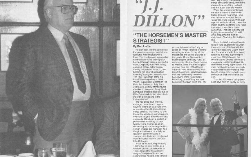 Next, an article by Don Liable about J.J. Dillon, the premiere manager in all of professional wrestling. Originally from New Jersey, James J. Dillon has done it all: the former Texas Heavyweight champion and Texas Brass Knucks champion has wrestled, promoted, announced, and managed. He’s been a student of professional wrestling for twenty years, and he now manages the NWA champion and the NWA world tag team champions. “He’s like what Vince Lombardi was to the Green Bay Packers,” says NWA promoter Fred Mard. Cities such as Boston, Philadelphia and Baltimore, all traditional promotional strongholds of the NWA’s arch rival, the World Wrestling Federation, have slowly but surely become NWA towns and more specifically, J.J.’s stomping grounds. One way or another, J.J. has proven to be the master of getting what he wants. The white stretch limousines, private jet flights from the various arenas and first class hotel accommodations are the norm for Dillon and his crew. He is also widely regarded as a tough man to deal with when it comes time to negotiate contracts for his men. There have been scores more physically tough than J.J., but no one has come close to his success as the one and only brain of professional wrestling. (Is the writer trying to stick it Bobby Heenan or something?)