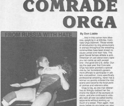 Next, an article about Comrade Orga: From Russia with Hate. Hailing from Moscow, Orga Stalinski weighs 205 lbs and hates everything about America except the good ol’ U.S. dollar. Orga has been granted a special visa by her homeland’s officials to participate in athletic competition, and now she’s gleefully stomping the breath of her opponents. (This was actually Glens Falls, New York native Shirl Sprague, who only had a few matches and died in 1996 at the age of 27.)