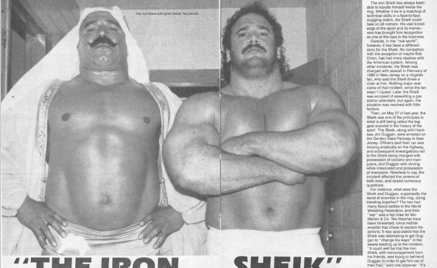 Next, an article about The Iron Sheik by Tom Clutters. The Sheik has always been able to handle himself in the ring. Outside, however, it’s been a different story. No competitor, with the exception of Bob Orton, has had more clashes with the American system. Among the incidents, the Sheik was charged with multiple assaults and then caught with marijuana and cocaine while traveling with Hacksaw Jim Duggan. The latter incident raised a question that has yet to be answered. What were Sheik and Duggan, supposedly the worst of enemies, doing traveling together? Two theories have been forwarded. One is that Sheik was attempting to get Duggan to change his ways. “It could well be Sheik befriended Duggan to get him out of his hair. It’s a trick that’s been used in the past.” The other theory is that Duggan befriended Sheik to help the latter turn his life around. Let’s not forget that Sheik was once Kosrow Vaziri, a coach for the U.S. Olympic team in 1972. It could well be that Duggan was trying to convert the Sheik to the role of hero. Nonetheless, the Sheik’s fortunes have taken a downward turn, and another question lingers: is the end approaching for this former WWF champion?