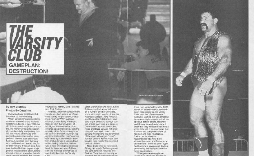 Next up, an article about the Varsity Club by Tom Clutters. Everyone knows ringleader Kevin Sullivan is always up to something, and now he’s taken Mike Rotundo and Rick Steiner under his wing. Rotundo, the Florida champion, was a talented but boring babyface. Steiner was a hard-working but colorless heel. In these two men, Sullivan saw the makings of what was to eventually become the Varsity Club. (Too bad Sunny wasn’t around. Having her as a cheerleader/manager would have made more sense.) Since Sullivan’s conversion to Satan-worship in 1981, he had had a vast influence on a number of wrestling, including Luna Vachon and Fallen Angel. Now it was time for new blood. Under Sullivan’s guidance, Rotundo defeated Nikita Koloff for the World TV title. Rotundo, in turn, gave his Florida championship to Steiner. (The magazine clarifies: “While NWA officials insist Rotundo was still the Florida champion, they allowed Steiner to keep the belt.”) No one can say for certain where Sullivan’s warped mind will take this club, but everything he does is by design. He always has a plan. “He’s not called the Gamesmaster for nothing. Each move, each event, is the result of long and careful consideration.” As for Sullivan, he promises, “Before you know it, the Varsity Club will be the most powerful force in wrestling, and I will have total control.”