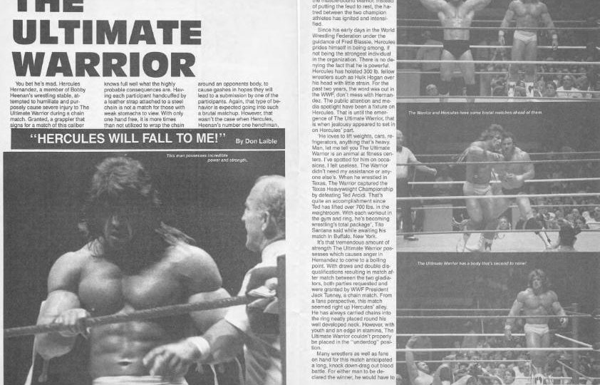 Next up, an article about the Ultimate Warrior/Hercules Hernandez feud. Hercules prides himself in being among the strongest individuals in the WWF, and there’s no denying it. He’s hoisted 300-pound wrestlers over his head with little strain. But now the public’s attention has turned to the Ultimate Warrior, and Herc is jealous. Worse yet, the Warrior is younger and still improving. “With each workout in the gym and in the ring, he’s becoming wrestling’s total package,” says Tito Santana while awaiting a match in Buffalo, New York. And now the Warrior has Hercules square in his sights. “Hernandez is a tough character,” says Koko B. Ware. “I’m not selling him short. But there’s no amount of money that he or anyone could offer me to be in his boots now.”