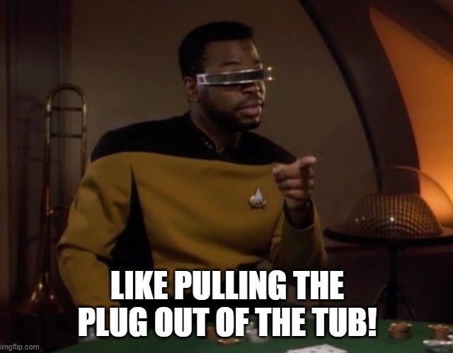 What? That doesn’t even make any sense! They don’t even HAVE bathtubs in the future, except for the one time Riker and Troi were getting it on in Insurrection. Maybe go back to stalking Dr. Brahms and leave the metaphors to the experts.