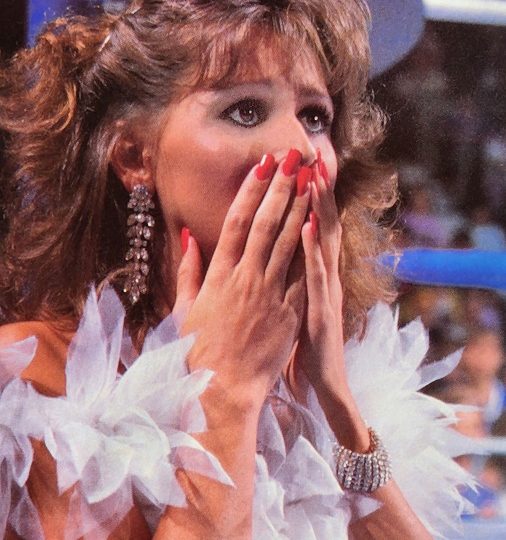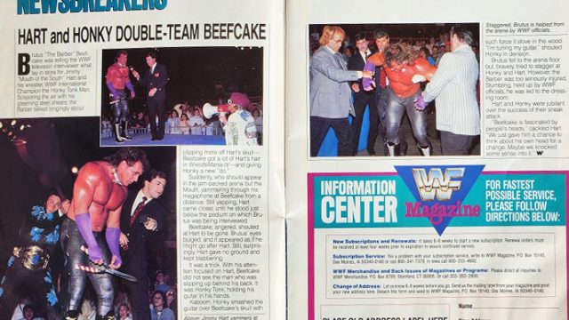 Next, we get more Beefcake in an article about a match between Beefcake and Honky for the Intercontinental title where Jimmy Hart was banned from the arena… only for a bearded Peggy Sue to interfere. Turns out Peggy Sue was actually Jimmy Hart! This was after Hart interfered at WrestleMania IV. (Hart, for his part, claims referee Jimmy Korderas knocked himself out, which must be an inside joke because that’s what actually happened.) That prompted the World Wrestling Federation Rules Committee to hold a closed-door session before ultimately deciding to ban Hart from the arena for a subsequent match. The day the event was to take place, WWF Magazine spied Hart in a local thrift shop. When a reporter approached him, the manager said he was shopping for his sweetheart. “When it was pointed out that a woman sporting a size 40 coat and size 32 waist was an oddity, the Mouth of the South responded, ‘Yes, she is a big girl, isn’t she?'” That night, during the match, Brutus was on his way to winning the IC belt when “Peggy Sue” hit the Barber with a purse. Brutus turned to chase “her” and Honky turned to chase him, and eventually both combatants were counted out. Meanwhile, Beefcake caught up to Peggy Sue and ripped her wig off to reveal the face of Jimmy Hart. Then he removed Jimmy’s sweatshirt and skirt, pulling bathroom tissue from the panty-clad imposter’s bra before Honky rushed his companion back to the locker room. Jimmy Hart, it should be noted, still claims it wasn’t him. “The real Peggy Sue was kidnapped, and the person you saw was a Jimmy Hart impersonator paid off by Brutus Beefcake. They just wanted to ruin my reputation. Simple as that.” (Could you imagine some celebrity in real life trying to get away with such an obvious lie? Oh wait…)