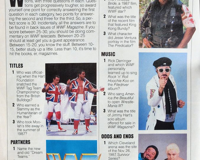 And here are the answers: Titles – Danny Davis, Ted DiBiase, Sensational Sherri. Partners – Dino Bravo & Greg Valentine and Brutus Beefcake & Valentine, DiBiase & Virgil, Little Tokyo & Lord Littlebrook. Movies – Andre the Giant, Moving, Sgt. Blain. Music – Mean Gene Okerlund, Aretha Franklin, Outrageous Conduct. Odds and Ends – Richfield Coliseum, Seattle Seahawks, 715 (Regarding the last question, I believe the weight was officially weighed at 712 after the lift.)