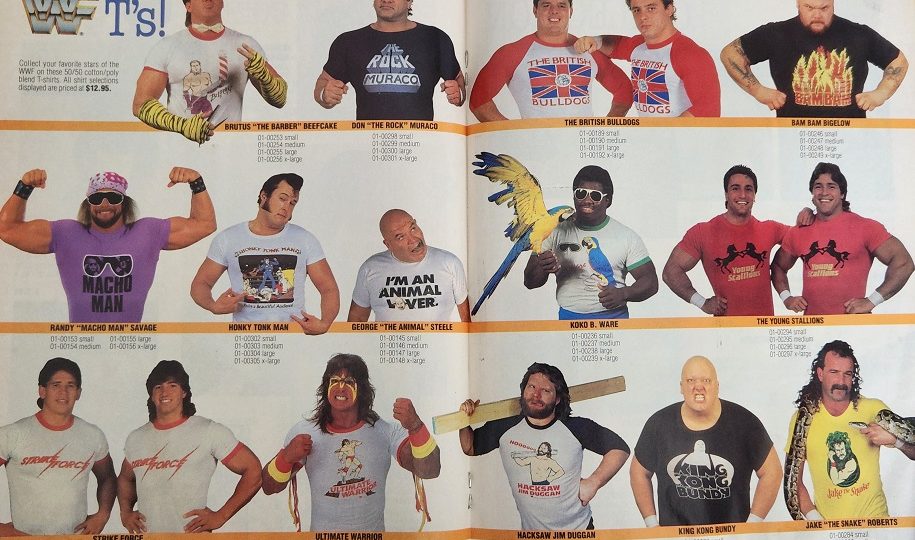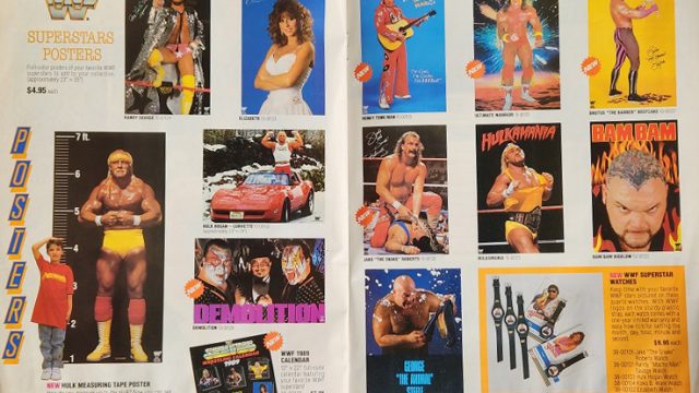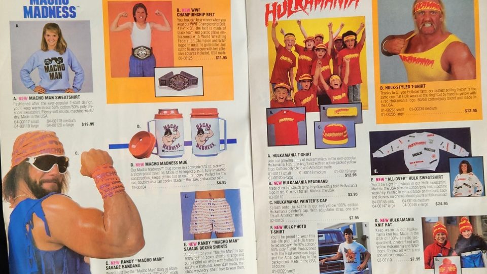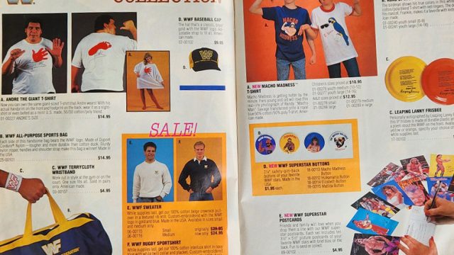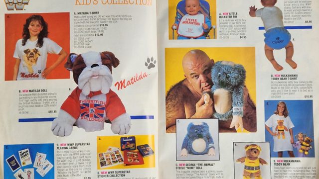 Next, it’s the new WWF Merchandise catalogue! Check out Shane O Mac trying to look cool standing next to a truck, modeling a Hulk Hogan shirt. Also, his sister, Stephanie McMahon, models a Matilda shirt.