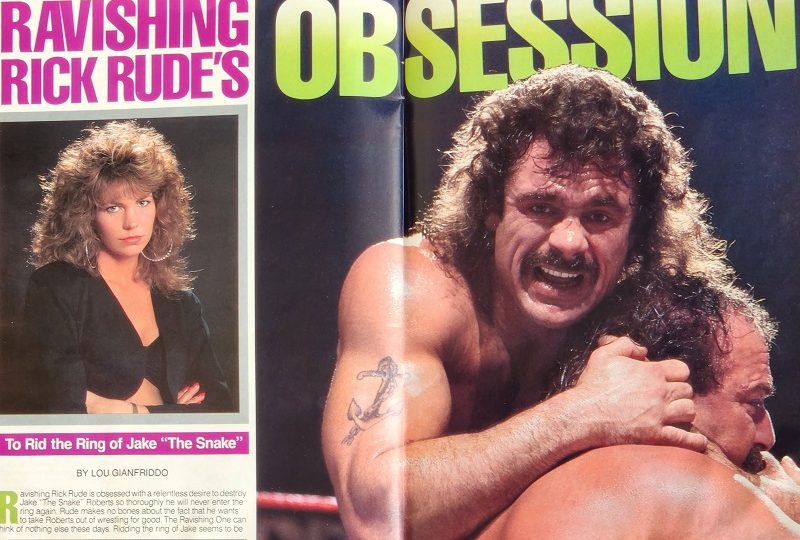 Next, an article about Rick Rude’s obsession with ridding the ring of Jake “the Snake” Roberts. This all stems from Rude being embarrassed by Jake’s wife, Mrs. Roberts. As fans know, Rude, not knowing who she was, invited her to the ring for a kiss, only to be rejected. Now Rude is verbally taking out his frustrations on the Snake. “You’re history, Jake Roberts,” he says. “Only you don’t know it yet. But you’re looking at the man who will put you out of wrestling for good. Then I’ll show your old lady what a real man’s like. I promise.”