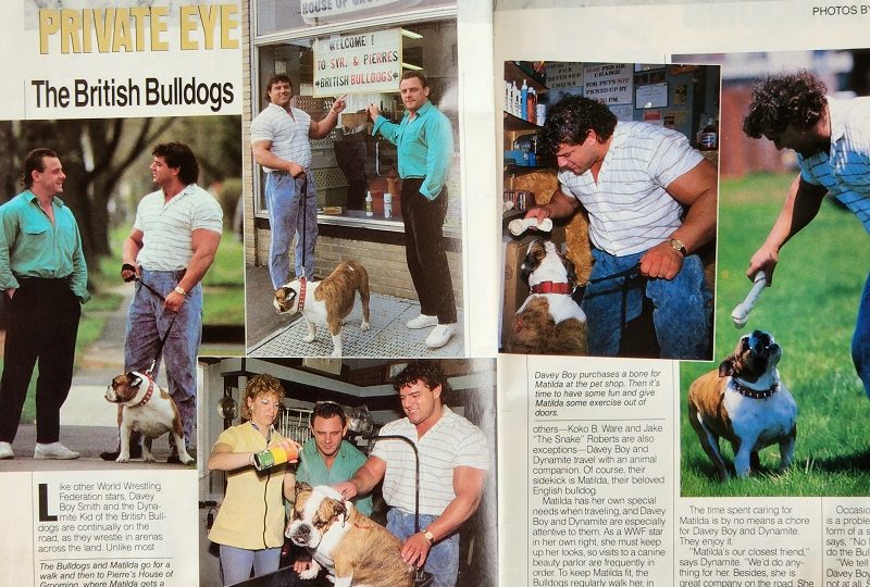 Next, in Private Eye, we’re told that Matilda, the mascot of the British Bulldogs, requires special needs when traveling, and Dynamite Kid and Davey Boy Smith are especially attentive to them. To keep Matilda fit, they regularly walk her. To keep up her looks, they visit canine beauty parlors. It’s a lot of work, but it’s all worth it. “Matilda’s our closest friend,” Dynamite says. “We’d do anything for her.”