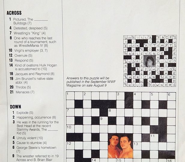 Onto WWF Lowdown: The Rougeau Brothers are now calling themselves The “Fabulous” Rougeau Brothers and seem to be trying new tactics and losing friends and fans in the process. Speculation is they are frustrated that they haven’t won the tag team title yet and might be looking for short cuts. Demolition, on the other hand, is looking more and more like true champions. “Everyone knows they are seasoned veterans,” the magazine says. “They hide from no challengers and are demonstrating they have smarts as well as brawn.” Meanwhile, the Ultimate Warrior has been patiently working his way up the ladder. No one is sure what to think of him yet, but combat between the ropes seems to be in his blood. Regarding the One Man Gang, manager Slick is working on some way to make the big man even more lethal. (Maybe the Gang just needs to find his African roots.) Hacksaw Jim Duggan continues to impress the magazine writers. “Duggan is known as a powerful man. But he’s even stronger than he appears. Take that two-by-four he carries around. He wields it without effort. But an ordinary man could hardly keep that piece of wood aloft with one hand.” With regard to Bad News Brown, the magazine again questions if his glove contains a foreign object. Brown says there’s nothing in the glove but a fist. In other news, word is Ted DiBiase is looking for another palatial home. The magazine suggests a place in Antarctica. Dino Bravo recently had a televised tug-of-war with Olympian Ken Patera that ended when Bravo intentionally crashed into Patera and began using the rope as a weapon. The WWF has new watches for sale! They’re in the merchandise catalog and are made by WWF licensee Celebrity Watches International. Greg Valentine is using a new hockey-style shin guard to “protect” his ankle. Opponents say he’s using it to make his figure-four leglock more effective. Jack Tunney is looking into the situation.