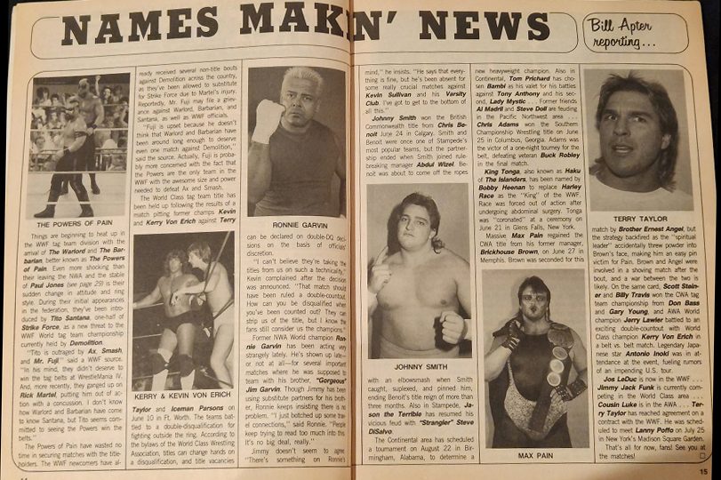 Next, Matt Brock’s Plain Speaking, where Matt, reporting from Glens Falls, declares Demolition dead. “You heard it here first, so remember me in a couple months when Demolition is wrestling in preliminary matches and The Powers of Pain have the WWF tag belts strapped tightly around those massive frames of theirs.” With Rick Martel out with an injury, Tito Santana has had to wrestle Demolition with substitute tag team partners, but his greatest coup might have been bringing The Powers of Pain to the WWF. Matt says they’re superior to Demolition in every way, and nobody in the WWF, save for those who watch other federations, have ever seen anything like them. “Already every manager wants to sign them, but I don’t think these guys want or need one.” (Yeah, that’s why they hired a manager for Summerslam before ditching him and taking another manager at Survivor Series!) Matt adds, “The fans love them already, and they have all the tools to go as far as they want.”