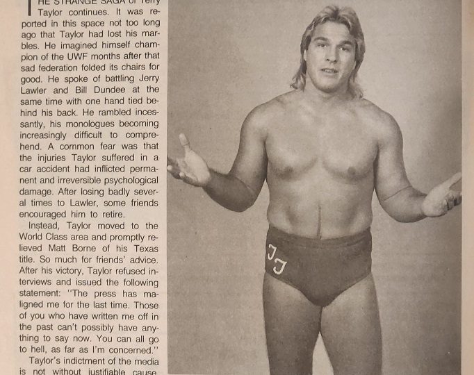 Next up, Liz Taylor is On Assignment and once again writing about Terry Taylor, who seems a bit crazy lately. “He imagined himself champion of the UWF months after that sad federation folded its chairs for good.” Liz says a while back she attended a press conference that Taylor stormed out of… because she was one of only two reporters to show up. Now the word is he’s signing with the WWF. When Liz tried to call him to find out more about this, he initially hung up on her before calling her back. “I guess you heard about the offer,” he said, unwilling to confirm if he was taking the deal. “Am I going? Maybe I am, maybe not. They sure offered me enough money. But I might tell ’em to take their money and shove it. Maybe I want a piece of Von Erich after all.”