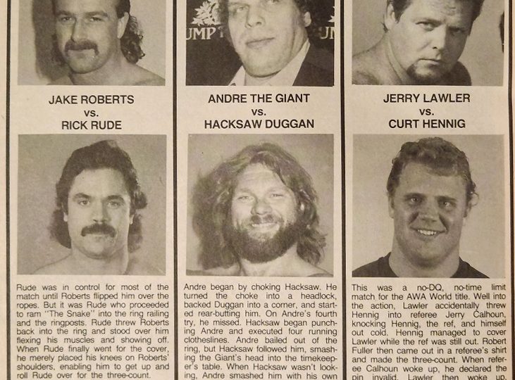 – The lead story is the WWF planning a giant stadium show in Milwaukee to basically screw with Crockett’s plans to run a Bash show the night after. The main event will be Hulk Hogan v. Andre the Giant in a cage match, which is expected to be a dry run for a series of matches between the two throughout the fall.