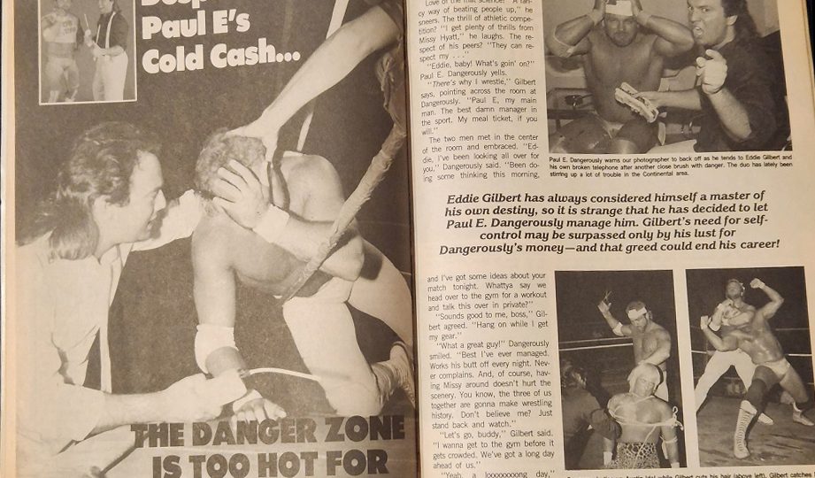 Next an article about Eddie Gilbert and Paul E. Dangerously. Gilbert’s usually not one for listening to others and being part of a stable, but in the case of Paul E. and the Dangerous Alliance, Gilbert made an exception. Why? “Money,” he says. In fact, it’s the only reason he wrestles. Love of the mat science? “A fancy way of beating people up,” he says. The thrill of competition? “I get plenty of thrills from Missy Hyatt,” he laughs. But his former tag team partner, Austin Idol, can’t believe Gilbert is willing to put up with Paul E’s crap. “Eddie won’t admit it, but he’s being overshadowed by Paul. Paul lured him in with big bucks, but he never had any intention of letting him share the power in the organization. That’s how he operates. He squeezes everything he can out of a man and then drop him like a hot potato. I can’t believe I ever trusted him.” Has Gilbert’s love of Dangerously’s money caused him to surrender control of his life? Welcome to “The Danger Zone,” Eddie.