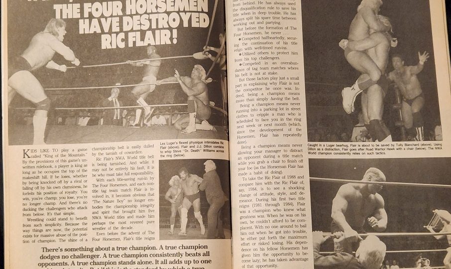 Next, an article about The Four Horsemen. The magazine says kids like to play “King of the Mountain” where whoever occupies the top of a makeshift hill is the King. If someone knocks you off or you fall down through sheer clumsiness, you become just another challenger. There’s no ducking challengers, no easy way out. If only wrestling was that simple. As things stand now, a World champion has the potential to massively abuse his power to stay on top. And with each title-saving run-in by the Four Horsemen, Ric Flair’s NWA title is tarnished. Inside Wrestling says that while Flair has cheated in the past, before the Four Horsemen entered his life, he never…