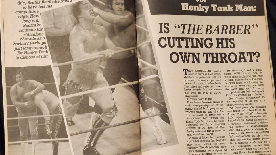 Next an article about Brutus “the Barber” Beefcake, who is chasing the Honky Tonk Man for the Intercontinental title. Inside Wrestling questions whether Beefcake really cares about the title. Why? Because he only seems to talk about cutting hair. Does Brutus dream of wearing the gold or creating the perfect hairdo? Is clipping an opponent’s scalp his idea of a fine time, or would he rather win a championship belt? A study of Brutus the moonlighting barber suggests he may have inhaled too much hairspray. and the clipper-crazy grappler’s insistence on scalping his opponents threatens to compromise his championship career goals beyond repair.