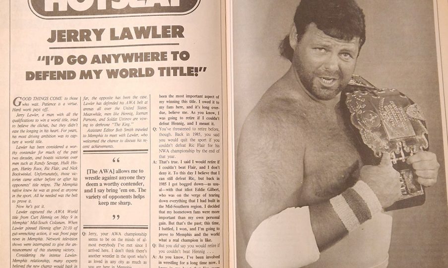 Next, AWA champion Jerry Lawler sits down in the Hotseat for an interview. Lawler is congratulated on the championship but reminded that in 1985, he said he’d retire if he couldn’t defeat Ric Flair for the NWA title. Lawler says, “That’s true. I said I would, but to this day I believe that I can still defeat Ric Flair. I got bogged down, and I decided that my hometown fans were more important than my personal gain.” Asked about the match where he defeated Hennig for the AWA title, Lawler says, “Believe it or not, I really thought the referee would stop the match because of a nasty cut I had over my right eye. Thankfully, he realized the importance of the situation. If Hennig had ripped my arms and my legs off, I still would have continued.” It’s then pointed out that Lawler now has contenders from the AWA, CWA, and World Class waiting to wrestle him for the championship. “Thank goodness for those frequent flyer bonuses! Actually, I have to say defending the title is a lot easier than winning it, but the way things have gone so far, I sure as hell never get bored! But I want the wrestling world to know I’ll go anywhere to defend my World title. You know the big mistake these federations make is that the champions get pigeonholed into facing the same challengers in the same arenas all the time. Well, thankfully the AWA isn’t that way anymore. They allow me to wrestle against anyone they deem a worthy contender, and I say bring ’em on. The variety of opponents keeps me sharp” The magazine then brings up Paula Lawler’s article in PWI claiming the title has made Jerry a monster. Jerry says, “Look at it this way. I’ve had severe burns on my face as the result of Eddie Gilbert burning me. Paula sees how it effects me and my attitude around the house, but she doesn’t realize I have to fight fire with fire. She worries about how this will affect me in the long run, but think of it this way: if I didn’t try to rid wrestling of these kinds of men, they’d rule the sport. I’d do anything to prevent that from happening even if it creates some tension at home. You know, they’ve been calling me the ‘King’ for a long time, but I never had the chance to prove it. Now that I’m World champion, my job is to defeat all contenders.”