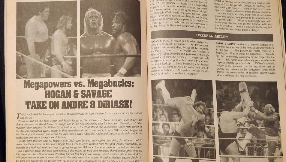 Next, a preview and analysis of the main event at Summerslam 88. The magazine concedes they found out just before press time that Hogan & Savage, the Megapowers, would wrestle Andre & DiBiase, the Megabucks, on pay-per-view. Nonetheless, the editors want to weigh in. In fact, we start with the weigh-in: the tale of the tape. Hogan is 6’8, 302 pounds. Savage is 6’2, 245 pounds. That combines for 547 pounds of humanity. In the other corner, Andre is 7’5 and weighs 497, and DiBiase is 6’4 and weighs 247. That’s 744 pounds, a distinct advantage. But Savage and Hogan have more muscle, with neither DiBiase or Andre having much definition in their frames. Where the teams seem equal is that each possesses a brawler and a technician, which could make for an interesting matchups. Then there are the intangibles. Insiders say Ricky Steamboat lost his drive and desire to be a wrestler after his wife gave birth. Will the same thing happen to Hogan? Also, what about Elizabeth? Will she play a role? If she is in danger, this could distract the Megapowers. Another late-breaking bit of news: Jesse Ventura will be the referee. (The magazine finds this ridiculous after the Hebner situation.) Ventura will probably favor Andre and DiBiase. But can Andre and DiBiase’s drastically different styles mesh?