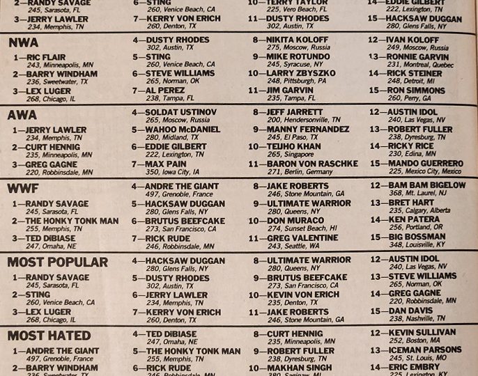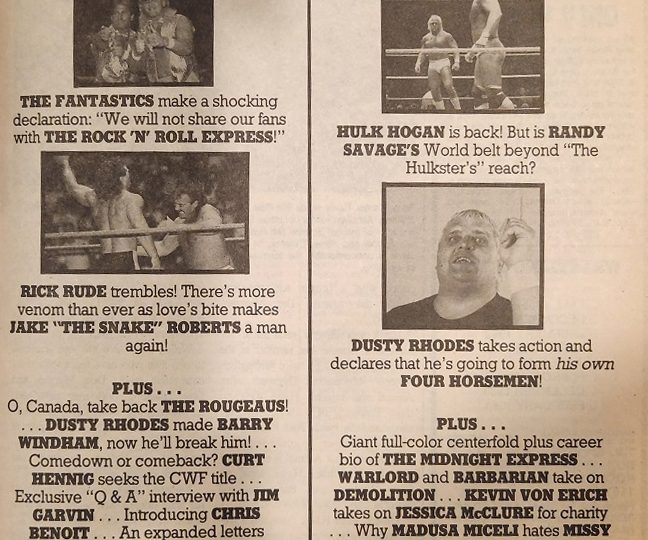 We begin with Sincerely Yours, the mailbag forum, where Greg from Los Angeles says he used to be a Four Horsemen fan, but their attack on street-clothed Lex Luger outside the James L. Knight Center (at Clash of the Champions 2) was just too much. “Wrestling is a sport of honor. The competition is meant to be contained within the confines of the ring.” Meanwhile, Jeff from Indianapolis says that everyone was saying Dusty Rhodes and the Midnight Rider were the same person, but Inside Wrestling’s August issue featuring a transcribed telephone conversation between the two proves they’re all wrong. “What more proof do you need that Dusty and the Rider are not one and the same?” Then there’s Nick from Miami who asks Ricky Steamboat to come back to the NWA. “Rick knows Ric Flair well, and I personally think Steamboat could take his title. (Yeah right, as if.) Larry from New Jersey says he recently attended an independent card, with a fourth row ticket costing $10, and saw Sgt. Slaughter, Johnny Rodz, Misty Blue, and Abdullah the Butcher. “I would strongly suggest that your readers check out the local promotions in their area.” And Candi from Waverly, Tennessee suggests fans check out the CWA. “Did you know that some of today’s top stars got their start in Memphis? I’m talking about guys like Hulk Hogan and the Rock ‘n’ Roll Express.” Candi says she has her eyes on one wrestler in particular. “I’m talking about none other than Jeff Jarrett. I’m no expert, but I’d say from his past accomplishments that he has the potential to become one of the greatest wrestlers today.” The next letter is from Jonathan from Madison, Wisconsin, who says Hawk of the Road Warriors is wrestling’s toughest, most sadistic and awesome wrestler today. And finally, Ken from Linden, New Jersey says it’s time to look past cartoon characters like Honky Tonk Man and Brutus Beefcake and look at real wrestlers like Greg Valentine and Don Muraco. “Both men have been in wrestling for almost 18 years each. Most of those years have been spent in a federation where youth and showmanship overshadow experience and true mat ability. Valentine has held the WWF tag team title as well as the Intercontinental belt; Muraco has won the I-C strap twice! And now, after countless numbers of feuds and many, many months as number-one contenders, these two are still wrestling at main-event caliber wherever you go. So, Vince, you can take your barbers, your snakes, and your birds. It’s the ‘Rocks’ and the ‘Hammers’ that bring realism to the word ‘superstar’!”