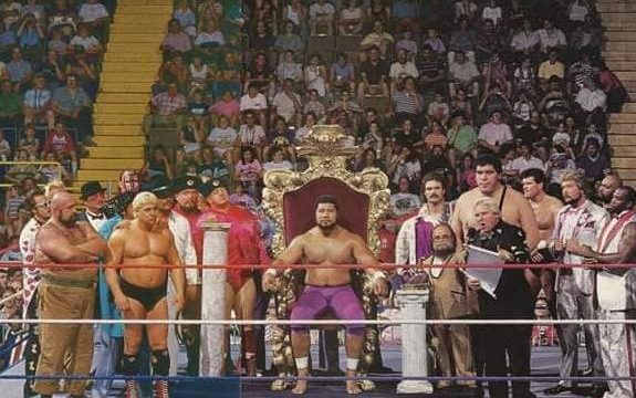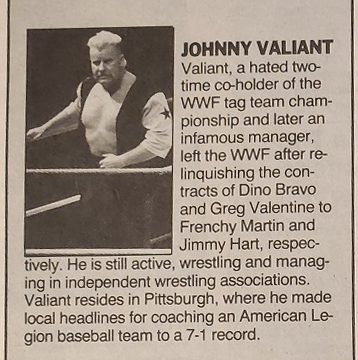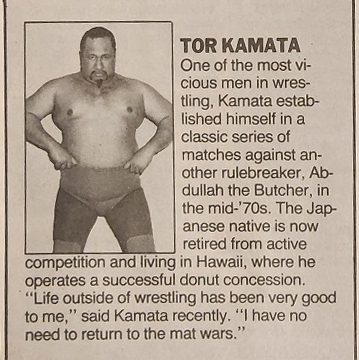 Next, Names Makin’ News with Bill Apter: The Powers of Pain, the Warlord and the Barbarian, have arrived in the WWF after leaving Paul Jones and the NWA. (More on this later in the issue.) Surprisingly, they were introduced by Tito Santana as fan favorites and have already wrestled Demolition in several non-title matches. In World Class, the tag team title has been held up following a match between the Von Erichs and Terry Taylor & Iceman Parsons that ended in a double-countout, which is being considered a double disqualification. According to World Class Wrestling Association bylaws, titles can change hands on disqualifications and a double DQ vacates the title. “I can’t believe they’re taking the titles from us on a double-countout,” says Kevin Von Erich. “How can you be disqualified when you’ve been counted out?” Ronnie Garvin has been acting strangely lately, showing up late for matches where he was supposed to team with his brother, Jimmy. Ronnie insists there’s no problem between the two. “I just botched some travel connections,” he says. (Foreshadowing!) Johnny Smith won the British Commonwealth title from former tag team partner Chris Benoit on June 24th in Calgary. Benoit was about (aboot?) to come off the ropes with an elbowsmash when Smith caught, suplexed, and pinned Benoit. Meanwhile, Jason the Terrible has resumed his vicious feud with Steve DiSalvo. The Continental area has scheduled a tournament on August 22 in Birmingham to determine a new champion. Also in Continental, Tom Prichard has chosen Bambi as his valet for his battles against Tony Anthony and Lady Mystic. In the Pacific Northwest, Al Madril and Steve Doll are feuding. Chris Adams won the Southern Championship Wrestling title on June 25 in Columbus, Georgia in a one-night tournament after defeating Buck Robley in the finals. Haku of the Islanders has been named the new King by Bobby Heenan after Harley Race was forced out of action due to abdominal surgery. Haku was crowned at a ceremony on June 21 in Glens Falls, New York. (Home of the next King!) Max Pain regained the CWA title from his former manager, Brickhouse Brown, on June 27 in Memphis. Brown was seconded for this match by Brother Ernest Angel, but the strategy backfired as the “spiritual leader” accidentally threw powder into Brown’s face, making him an easy pin victim for Pain. Brown and Angel got into a shoving match after the bout. On the same card, Scott Steiner and Billy Travis won the CWA tag team championship from Don Bass & Gary Young, and AWA champ Jerry Lawler battled to a double-countout with World Class champion Kerry Von Erich in a belt vs. belt match. (So does that mean the WCCW belt is now vacant? No? Okay, just checking. It’s not like we should be consistent, right?) Of note, Antonio Inoki was in attendance at the event, fueling rumors of an impending U.S. tour. Jimmy Jack Funk is now competing in the World Class area. Cousin Luke has entered the AWA. Terry Taylor signed with the WWF. And finally, Jos LeDuc is now in the WWF. (He can actually be seen at Haku’s coronation to the left next to Dino Bravo, but he’d be gone before the end of summer.)
