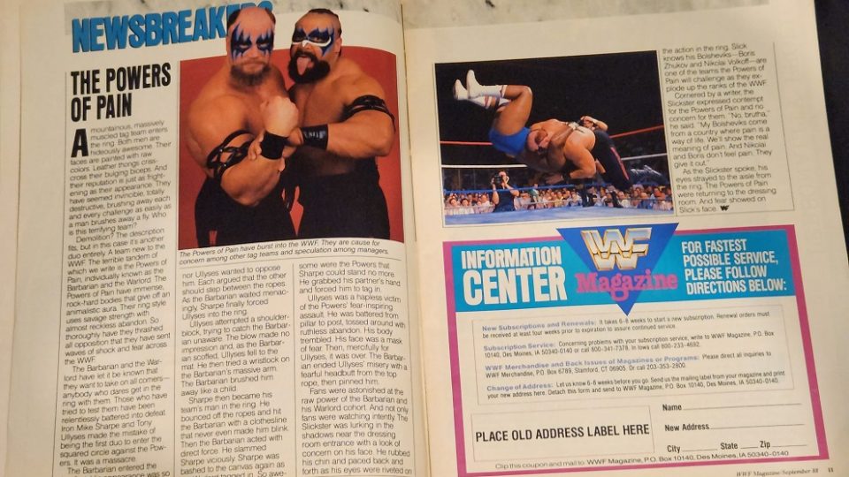 Newsbreakers! There’s a new tag team in the WWF. It’s comprised of the Barbarian and the Warlord and goes by the name The Powers of Pain. They remind a lot of people of Demolition and have sent waves of shock and fear across the WWF. Their first target? The Bolsheviks, managed by Slick. Slickster says his team is ready. “The Bolsheviks come from a country where pain is a way of life. We’ll show them the real meaning of pain.”