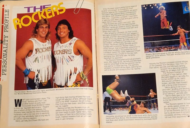 Next up, Personality Profile introduces us to the Rockers. (I think it’s fair to say Vince saw some holes forming in his tag team division and decided to take action.) Marty Jannetty and Shawn Michaels are high-flying, fast-moving whizzes that have caught the attention of fans. Jannetty says, “We’re going to be rockin’ and rollin’, strutting and strolling, doing our thing and having a lot of fun doing it.” Michaels says eventually they’re going to fight their way to the top of the WWF, but right now they’re just hoping to secure some matches against the Conquistadors.