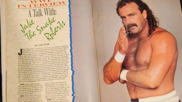 Next, an interview with Jake “The Snake” Roberts, who’s in the midst of a feud with Rick Rude. Roberts says he’s a volcano about to explode, and when he’s done with Rude, the Ravishing One will be kissing the mat. Asked why Rude seems as mad at Jake as Jake is at Rude, Jake says it’s because Cheryl (Jake’s wife) rejected Rude, and it destroyed Rude’s sense of manhood. “He’s insecure and real women know it.” Asked if he’s too preoccupied with Rude to see the big picture, and if that will lead him to let down his guard against someone else, Jake says, “Let down my guard? That’s not for the Snake. I’m always on guard. I’m always ready for the worst. That’s the key to survival.”
