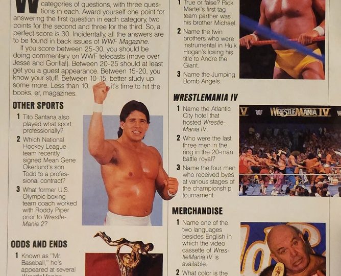 We begin with Around the Ring by Ed Ricciuti, where Ed says there’s a new pay-per-view special called SummerSlam that will air on August 29 at 8:00 p.m. (Curiously, the magazine doesn’t say what time zone that’s for.) Ed then says we might have noticed a new feature in the magazine last month: a Trivia column. He asks us to write in and tell us what we think of it. Lastly, Ed reminds us that WWF Magazine isn’t the only publication from the WWF. There are also programs available at live events, including one for the upcoming SummerSlam. “And in October, we will introduce a brand-new quarterly publication, WWF Spotlight, featuring an in-depth look at a WWF Superstar.” The subject of the first Spotlight? Randy Savage. “Keep an eye out for this real treat.”