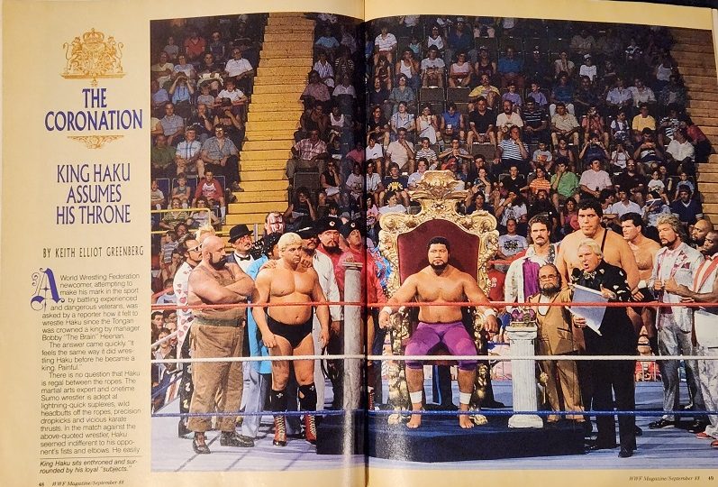 Next, all hail Haku, the new king! Bobby Heenan is still upset with Hogan for injuring Harley Race by virtue of moving out of the way when the former King tried to dive on him. (This was a table spot, but it didn’t go as planned. Race later said, “Like an idiot, I didn’t even go out to the ring and look at the table before the match. Later, I had no problem going through it for the spot. It didn’t even hurt that much…until I tried to get up, that is. That’s when the steel band that wraps around the edge of the table recoiled and hit me just above the pelvic bone. I would have been better off if the damn thing would have just hit the bone and broke it. Still, I just shrugged it off and kept wrestling. That’s not to say that it didn’t hurt.” Race kept wrestling for a while, but eventually his intestinal injury led to an infection that almost took his life.) Heenan says that after Race was forced to abdicate his thrown, many wrestlers sent in applications hoping to be crowned the next king, including Hogan himself. (Hogan denies this.) Eventually, Heenan settled on Haku due to his impressive combat skills, his win-loss record, and the ability to speak several languages. (Plus, it’s Haku. Would you say no to him?) He also adds that we shouldn’t be surprised if the King goes on to win the WWF title too. “And Elizabeth just might be his queen,” Heenan says, “bringing Haku grapes and fanning him.” Haku, for his part, now wears purple and refuses to sign autographs. (I ran into him around this time, and when he refused to sign my program, I threatened to knock him on his keister. He immediately said, “I’m sorry, sir,” and signed my program. And yes, I just made that story up.)