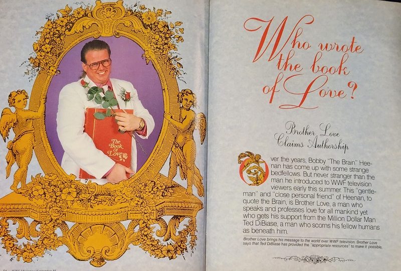 Next, introducing Brother Love! (I recently heard my local radio station using his theme music in the background while the disc jockeys were talking about people asking priests, ministers, and rabbis for advice on which NFL teams to bet on.) Brother Love is a friend of Bobby Heenan’s with the financial backing of Ted DiBiase who claims to spread the word of love. The writers of the magazine are skeptical. (I’ve got to give it to Bruce. He really threw himself into the role. But you know who would have also been good in the part? Jim Cornette! And unlike Bruce, who had too many backstage duties to be a fulltime manager, Jim could have done the interview segments and managed guys too.)