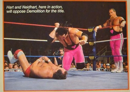 The magazine says it will be a classic encounter pitting the Foundation’s Hart Attack, a slingshot clothesline, against Demolition’s perilous finishing maneuver, where one member of the team comes down with an elbow off the second rope to hit an opponent draped across his partner’s knee. (Yes, the magazine still doesn’t have a name for the latter.) And that’s all the coverage we get going into SummerSlam 88!