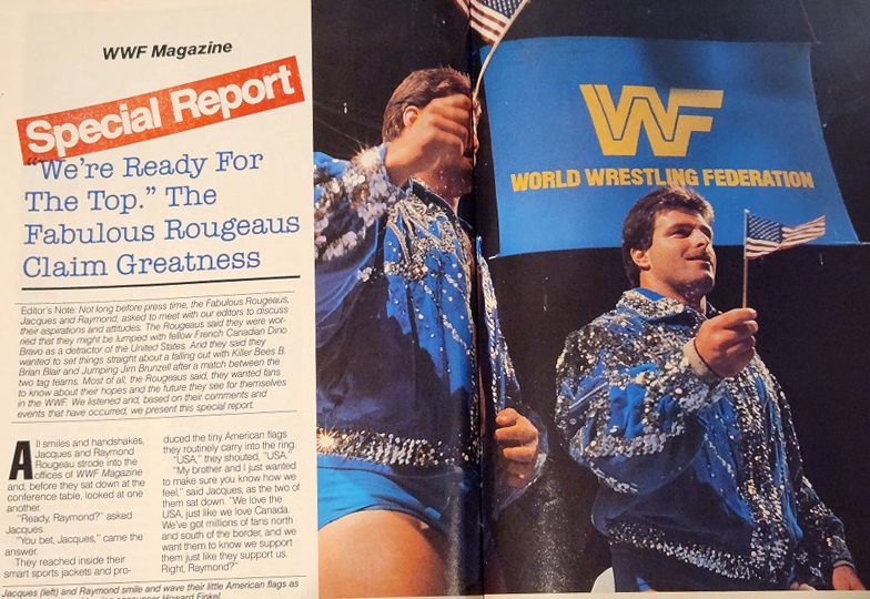 Next, we catch up with the Rougeau Brothers, Jacques and Raymond, who are now calling themselves the Fabulous Rougeau Brothers. They want you to know that just because they’re from the same place as Dino Bravo, they aren’t like him. They love America. Can’t you tell by their little flags? We then get a recap of a match they had against the Killer Bees, Jim Brunzell and B. Brian Blair, where the Rougeaus kept offering handshakes to their opponents “out of respect.” Eventually, the Bees got tired of it and lost their tempers before the Rougeaus performed some moves of questionable legality behind the referee’s back before notched a pinfall victory. While the Bees attempted to protest the decision, the Rougeaus offered them another handshake… which the Bees again declined. “We’re sorry the Bees were angry,” says Jacques. “But that’s the way it goes. They’ll cool down, and we’ll shake hands again. We’re sure Jim and Brian will appreciate it when we’re on top.”