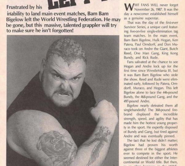 Next, Bam Bam Bigelow explains why he left the WWF. The big man says that contrary to PWI’s article claiming Oliver Humperdink was a poor manager, “Humper” was actually fine. The problem was the WWF lost interest in Bam Bam when Savage won the title, and the Bammer found himself wrestling the One Man Gang over and over and going nowhere. “Naturally, I wanted to face Ted DiBiase and Andre, but those kind of matches were few and far inbetween. You know, the WWF is like a four-man show. There’s a lot of attention focused toward Hulk vs. Andre and Savage vs. DiBiase, but that didn’t leave any room for Bam Bam Bigelow. I was getting stale, and I didn’t want to wear out my welcome with the fans.” Bigelow nonetheless looks back at his WWF run with fondness. He says the fans were great, and he intends to come back one day.