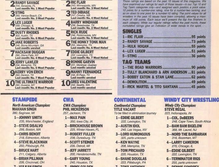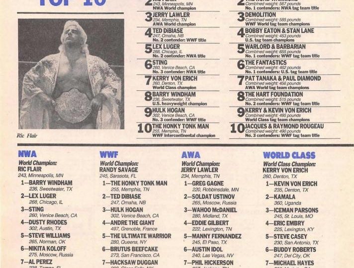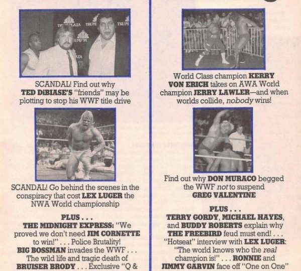 Next, an article about Jerry Lawler, who is now taking on every champion he can, be they part of the CWA, CWF, or World Class. But he can’t get permission from the WWF or the NWA to wrestle their champions, Randy Savage and Ric Flair. No matter, he says. He’s already beaten both men. “And you know what that means? I’m the best.” (This point would be emphasized in the title unification match between Lawler and Kerry Von Erich at SuperClash III, with the announcers claiming both Lawler and Von Erich both defeated Savage and Flair in the past, making them the top two wrestlers in the world.) PWI fact-checks this, saying it’s “somewhat true,” but noting there are some qualifications: first, while Lawler and Savage had legendary matches in the mid-1980s, neither was able to score a clean pinfall over the other. As for Lawler and Flair, it was a similar story. They only wrestled a few times during Flair’s third title reign in 1985, and Lawler was only able to win by count-out or disqualification. Lawler, however, says he knows he can beat both men today, and if they feel differently, they should get in the ring and prove him wrong.