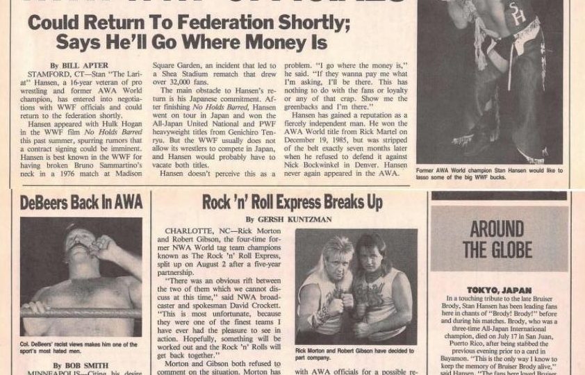 Breaking news! Stan Hansen might be headed to the WWF, and the Rock ‘n’ Roll Express has broken up! Also, in a bit of sad news, J.R. Foley, an English wrestler and Stampede wrestling manager, has died at the age of 50. And Continental has bought USA Wrestling.