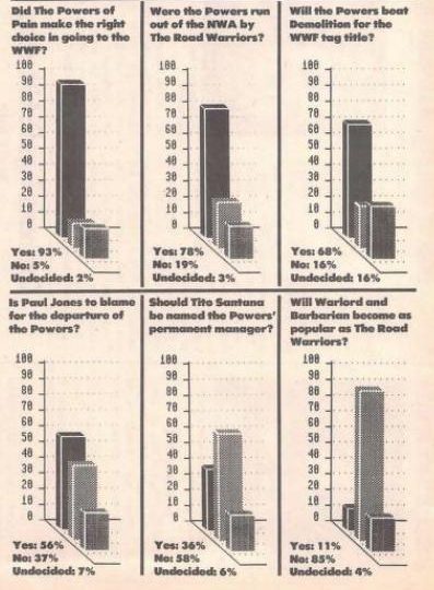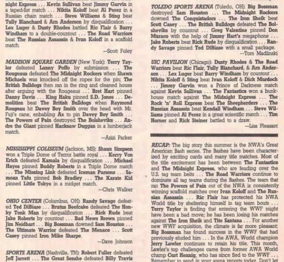 Meanwhile, Karen from Higginsville, Missouri says it’s great to see Jerry Lawler and Kerry Von Erich wrestling each other with respect and manners instead of yelling and screaming. “We need more of that today.” And Theresa from Houston says Lex Luger was robbed at the Great American Bash when doctors stopped the match on account of blood. “The blood from Luger’s cut was not nearly as bad as cuts other men have acquired in the ring.” Then there’s Gaspar from New York who says he was disappointed in the cage match between Savage and DiBiase at Madison Square Garden because both guys kept trying to run away from each other as opposed to wrestling due to the rules saying whoever escapes the cage first wins. And Thomas from Long Beach, California sings the praises of Lord Humongous of the CWA, saying he’s unstoppable. (Especially when he has a squeegee.) On another subject, Michael from Henderson, North Carolina says fan Matt Kirsch was wrong when he wrote a letter saying Steve Williams couldn’t wrestle his way out of a paper bag. “I would like to inform you, Mr. Kirsch, that Dr. Death was an All-American wrestler at the University of Oklahoma. He also held the UWF heavyweight title which he never lost and won the PWI/UWF Cup, which earned him $50,000 and a secure spot in the hearts of fans everywhere.”