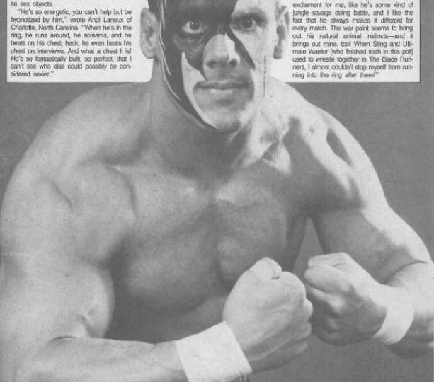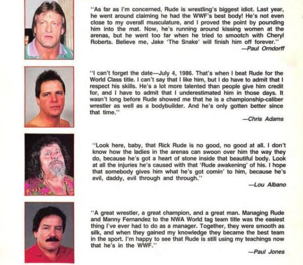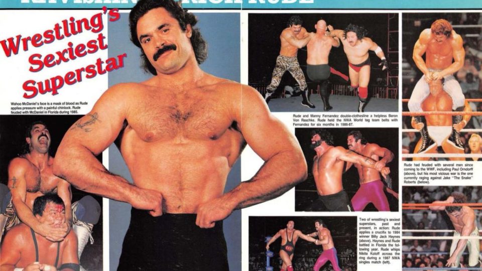From a fan: “Rick Rude is the ultimate embodiment of sex. There isn’t a specific body part that impresses me more than any other, it’s just a matter of Rude being so complete and perfect that he simply sets me swooning as soon as I look at a photo of him or hear his name. I usually find myself leaving the arena before his match even begins. And that’s not because I don’t like him, it’s because I’m trying to keep myself under control. Just the sight of him gets me too crazy.”