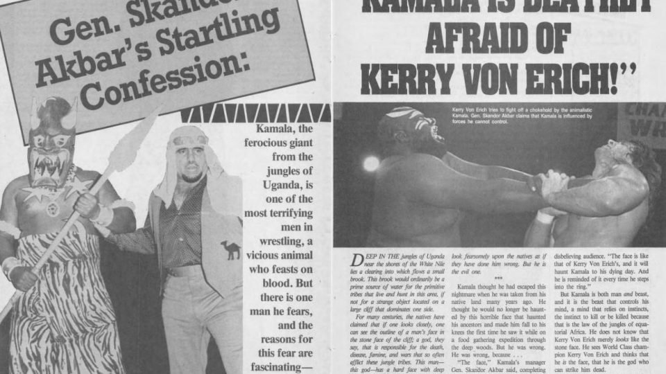 Next, an article about Kamala being afraid of Kerry Von Erich. Kamala’s manager, General Akbar says that where Kamala grew up in Uganda, Africa, there was the face of a God responsible for death, disease, famine, and wars on a cliff face. The face was always watching Kamala’s tribe, and each member was deathly afraid of it. And the face looked exactly like Kerry Von Erich. For that reason, Kamala cannot bring himself to look upon the World Class champion, and Akbar doesn’t know how to handle it. (It’s a trap!)