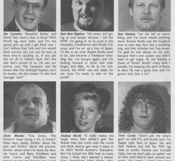 We begin with Fan Forum, where Bernard from Battle Creek, Michigan says he enjoyed reading Wrestling Superstars’ analysis of a dream match between Hulk Hogan and Mike Tyson. “This one transcended the mat sport. It would be like planets colliding!” But whereas the writers say Hogan would probably win the matchup, Bernard says he’s not so sure. “I don’t think Tyson would lose to Hulk Hogan.” Mike from Richmond, Virginia, on the other hand, says the magazine should stick to wrestler vs. wrestler dream matches. “But,” he adds, “if anyone could beat Tyson, it is certainly Hogan.” Meanwhile, Rolene from Somerset, Texas says she recently attended an event in Houston to see Barry Windham, and she ended up seated next to a Lex Luger fan who called her names! “I almost threw her into the ring then and there, but I decided it wasn’t worth the bother.” (Has there ever been a spontaneous bra and panties fan match?) Then there’s Jerry Parent of Elk River, Minnesota who says everyone wants to know what’s wrong with the AWA, but the answer is obviously AWA president Stanley Blackburn. “His illegitimate decisions have brought the AWA to the brink of folding.” And Mark from Verona, New Jersey says that while Hacksaw Jim Duggan likes to think he’s David and Andre’s Goliath, Duggan is really just a jerk who instigated the feud. “Duggan challenged Andre. Duggan butted into Andre’s business. Duggan belted Andre with a 2×4. Now the Giant is mad.” The next letter is from Andrew of Denver who says everyone’s always calling Dusty Rhodes fat, but Dusty moves as well as anyone and is an inspiration for everyone who’s not skinny or chiseled. “Since I’ve been watching him, I’ve stopped avoiding sports and am doing better in school.” And Nancy from Markala, Michigan says that while she appreciates a man’s body, she fears the magazine’s “Sexiest Superstar” contest might objectify men and devalue wrestling. “Yes, I like the muscular bodies of today’s young stars, but if they can’t wrestle, they just don’t flip my pancakes.” (Also, there’s another danger here. If we start objectifying men at the risk of devaluing them as people, the same thing could happen to women.) Then we hear from Lisa from Milwaukee, Wisconsin who says she was at Wrestlefest where she saw Terry Taylor wrestle Curt Hennig and thought it was unfair to throw Taylor into such a competitive match with little preparation. In addition, Taylor has had to wrestle guys like Lanny Poffo who have been in the WWF for so long, they are accustomed to the referees, the fans, and the arenas. (Who does Lisa want Taylor to wrestle, the popcorn vendor?) In closing, Lisa says the WWF should allow Taylor to get some seasoning . “Before long, he’ll have no problem with the finest wrestlers.” Lastly, Kurt from Bethesda, Maryland says Sting and Lex Luger have had their chances to beat Ric Flair, and they blew them. “I no longer want to know who the man is who can beat Ric Flair, I want to know can anybody beat Ric Flair?”