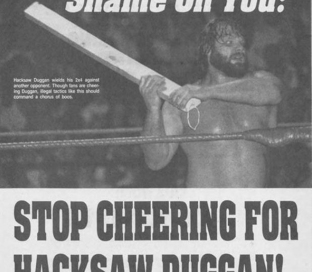 Next, the magazine has an article imploring the fans to stop cheering for Hacksaw Duggan. They say Duggan looks like something that’s been hibernating in the mountains for the past ten years, that he can only yell incoherently in interviews, and he always carries a foreign object. (Bret Hart would probably give him a couple of fours for look and mic skills.) Yet the fans cheer him nonetheless. Why? Because he chants USA? Is the man really a proper role model for children? Do we want to say, “Children, this is the way to deal with your problems. If somebody gets in your way, hit them with a 2×4.” Worse yet, the WWF even sells replicas of Duggan’s lumber at the concession stands! Cheer for men who uphold the rules an integrity of professional wrestling. Shawn Michaels. Davey Boy Smith. Dynamite Kid. Sam Houston. They deserve those cheers. But don’t cheer for Duggan. He has does nothing to enhance the image of the sport. He doesn’t deserve your cheers.