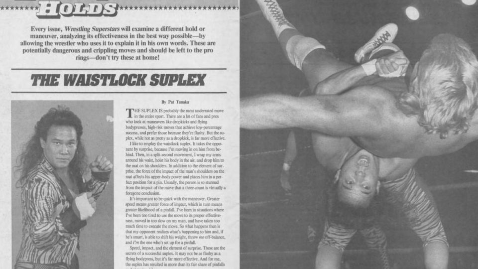Next, in Know Your Holds, Pat Tanaka teaches us about the Waistlock Suplex. He says it’s not as flashy as a flying dropkick or bodypress, but it’s less risky and more effective. The key to the move is to catch your opponent by surprise and perform the maneuver as quickly as possible. The faster you do it, the greater the impact and the less chance your opponent has to shift his weight, allowing you to use his weight against him and put him in a pinning predicament. “Speed, impact, and the element of surpise. These are all secrets of a successful suplex.”