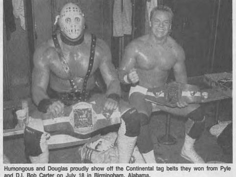 Next, an article about how Shane Douglas has changed Humongous. Humongous, who stands 6’8 and weighs 318 pounds and wrestles for the Continental Wrestling Federation, used to be one of the most hated men in the sport. Now he’s a fan favorite thanks to an intervention by youngster Shane Douglas. “Humongous was a confused man,” Douglas says. “The fans hated him because of his brutality, but he couldn’t understand that because it was all he knew how to do. But we were childhood friends in Pittsburgh, and I knew who he really was. When I caught up with him in the CWF, I gave him a big hug, and we knew we still had a connection.” Subsequently, Douglas was being interviewed when he was attacked by Downtown Bruno and Detroit Demolition. Who should come to the youngster’s rescue? Humongous himself. “Shane is my friend,” said the soft spoken Humongous afterward. “No one will attack him again.” The two friends formed a tag team, and now they’re the CWF tag team champions of the world.