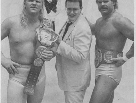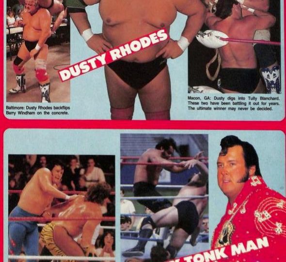 Next, an article about two rulebreaking teams going at it: The Midnight Express vs. Tully & Arn. The magazine says the feud has left the referees bewildered and the fans disoriented, but that doesn’t mean people aren’t enjoying it! Nonetheless, there have been different reactions. In Philadelphia, for example, the fans recently sided with Tully & Arn. In Richmond, however, the fans sided with the Midnights. Midnight manager Jim Cornette, however, insists his team isn’t turning into fan favorites. “Fan favorites?” he yells. “We’re here to win the World belts, that’s all. We’re not doing this to make points or make fans.” J.J. Dillon says something similar about his men, Tully and Arn. “The only thing that matters is the belts, and we have them.”