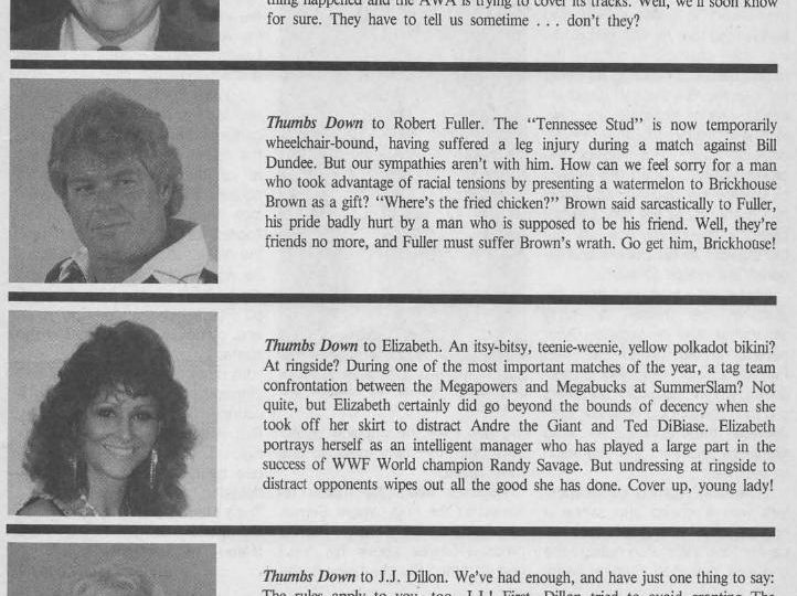 The Megapowers defeated the Megabucks at Summerslam before over 23,000 fans at Madison Square Garden thanks to Elizabeth, who proved she’d do anything for the Macho Man—including taking off her clothes! The magazine says, “Who really expected sweet Elizabeth to drop her skirt for all the world to see?”